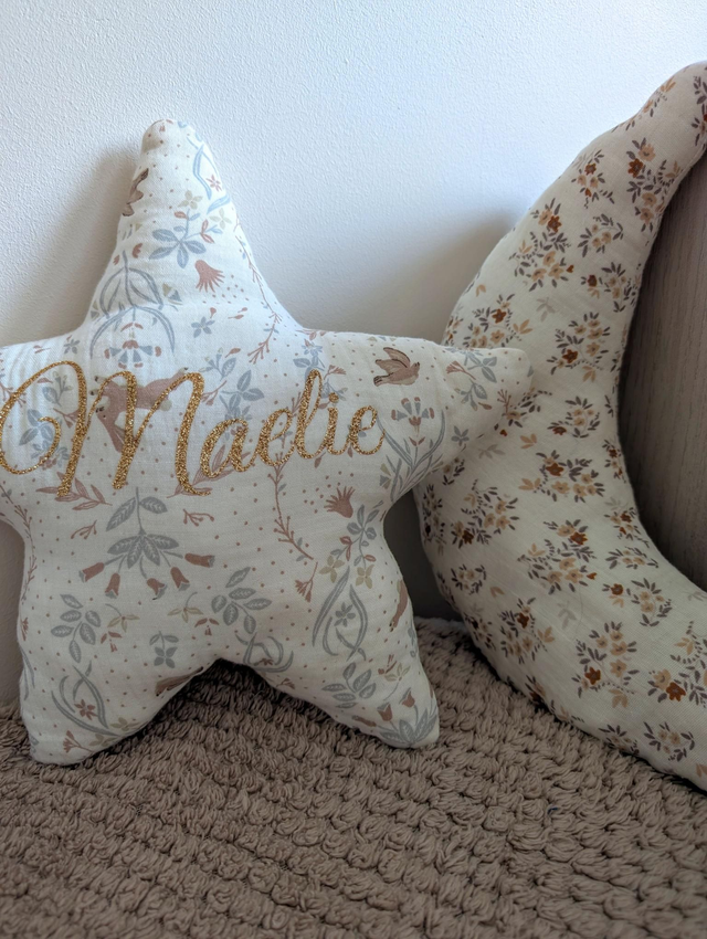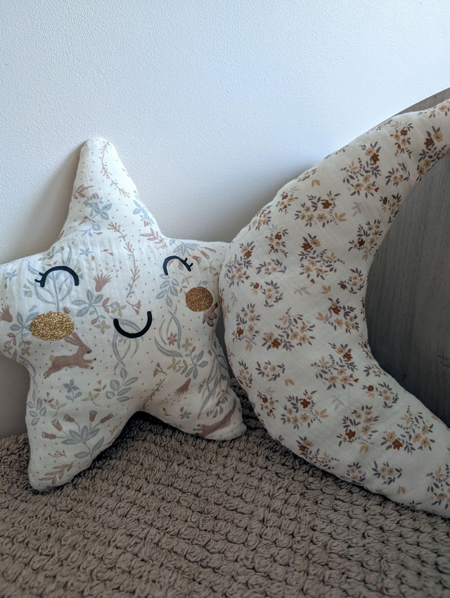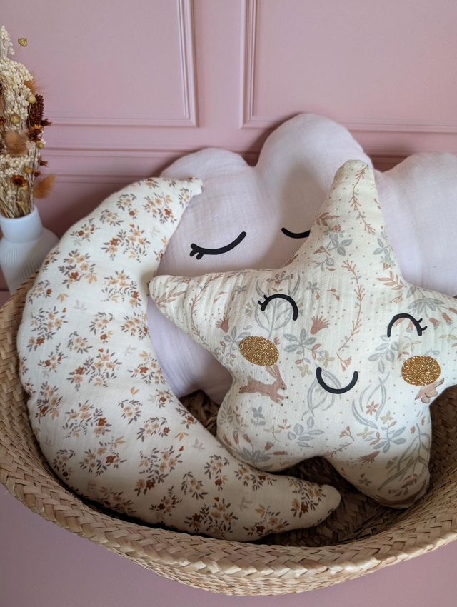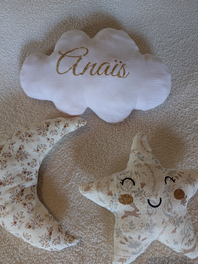 Disponible en plusieurs couleurs et trois formes : nuage, lune ou étoile. Confectionné sur commande dans mon atelier, le délai de réalisation peut varier selon l’activité.